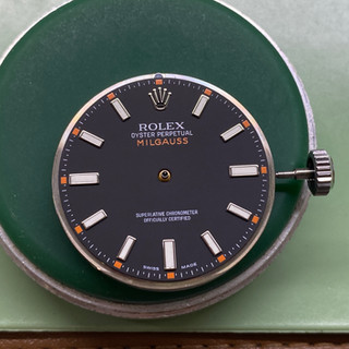 케이스에서 무브먼트를 빼내고 보면 밀가우스의 다이얼이 보입니다. 뿌리는 방식으로 제작된 다이얼인데, 바늘을 뺄 때 잘못하면 자국이 남아 안지워집니다.