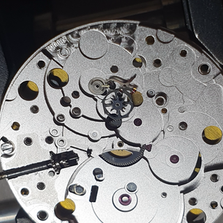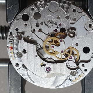 이스케이프먼트 휠은 사진상에 보이지 않지만 벨런스휠 밑에 팔렛포크와 함께 있습니다.